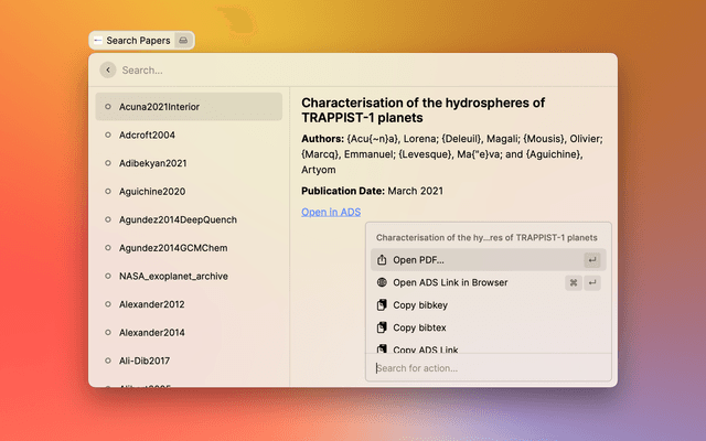 Extension for quickly accessing your bibmanager database from Raycast. Search the database (by bibkey, author, title, year or tags) and quickly access entries by opening or downloading the pdf. You can also open or copy the ADS link and copy the bibtex entry. Make sure to explore available actions in the action panel (⌘ + K).