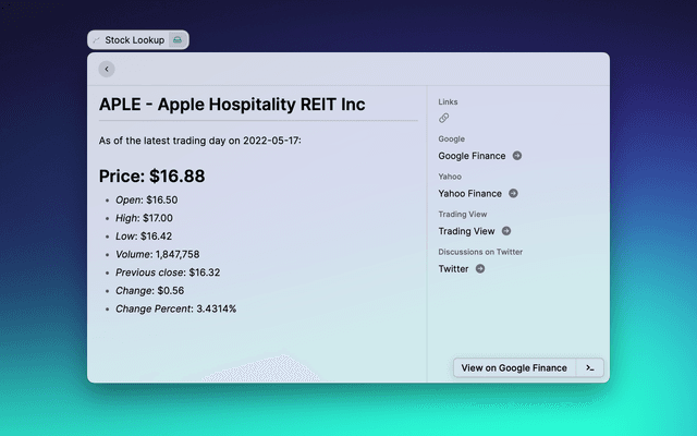 Retrieves stock information from the alphavantage API. Get a free API Key from https://www.alphavantage.co/support/#api-key or a paid one from https://www.alphavantage.co/premium/.
