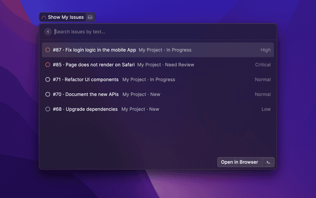 - Find your currently assigned issues, filter using Raycast by issue ID or subject keywords.
