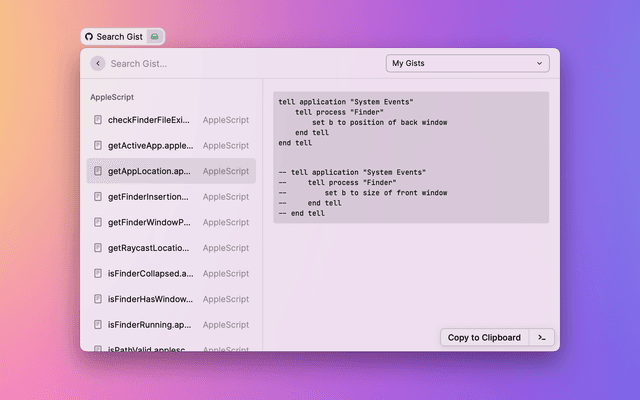 This extension brings GitHub Gist support to Raycast through the personal access tokens. To get started, first: