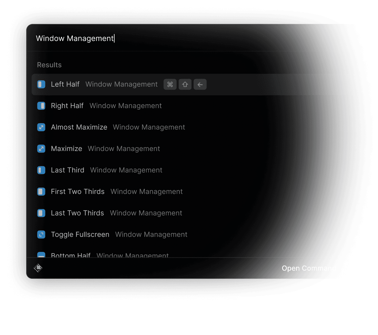 Raycast feels right at home on your Mac and is built with a keyboard-first approach that allows you to navigate the entire interface and use extensions without touching your mouse. You can perform any action with the standardized ⌘K Action menu, helping you stay in the flow.