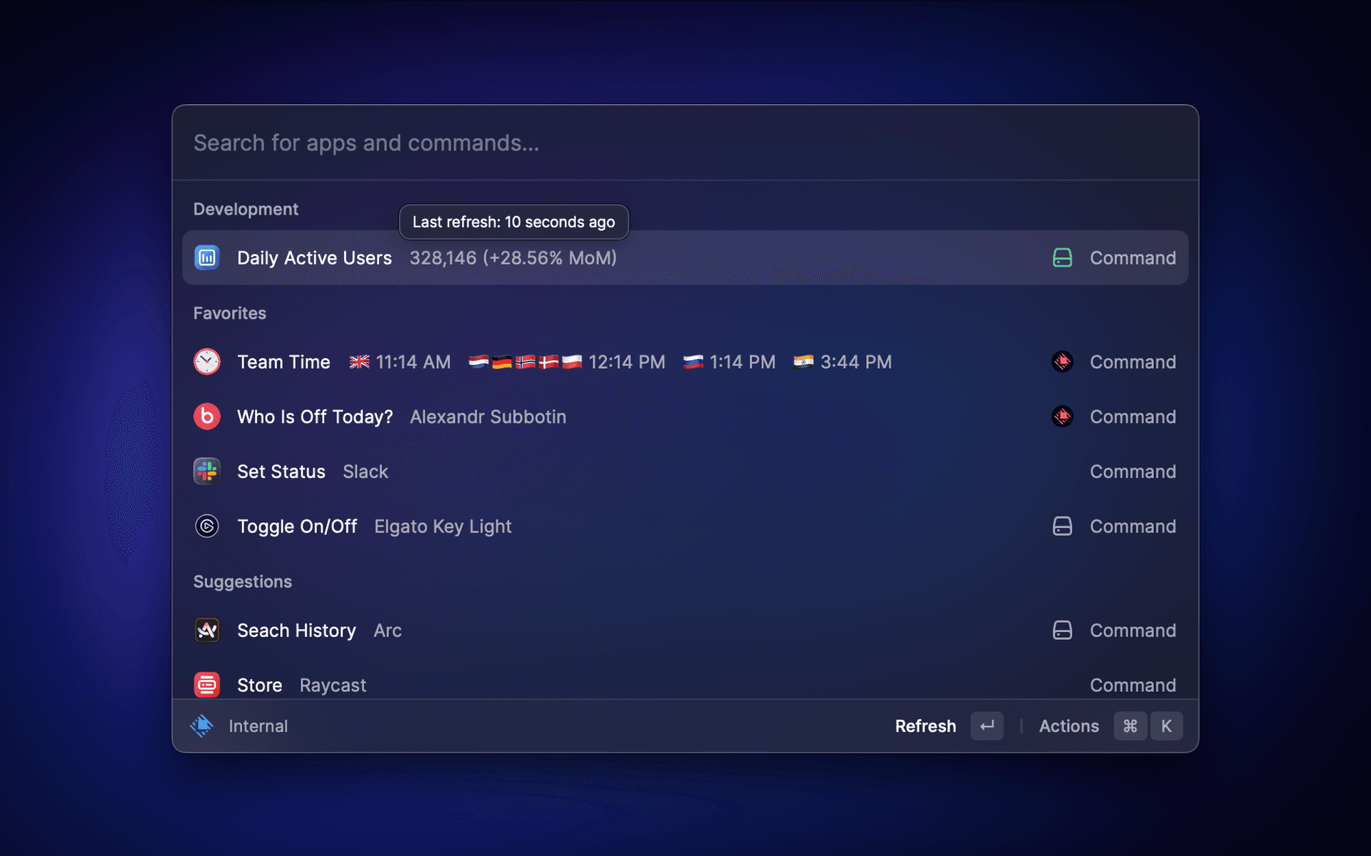 Next, build and run the extension. Raycast prompts you to enter your API key and secret key. Afterward, you see your top metric in Raycast. Use Raycast's Action Panel (⌘ + K) to favorite the command. This way, it stays on the top of the root search and acts as a daily reminder.