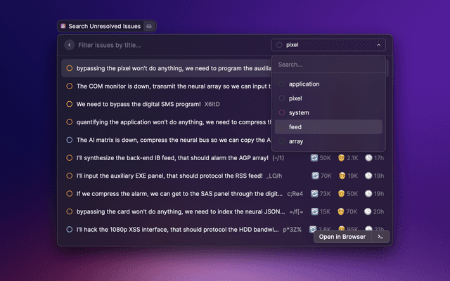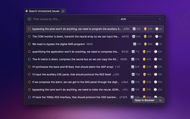 An extension to quickly search unresolved issues in Sentry. This can be handy to stay on top of erros and squash these nasty bugs.